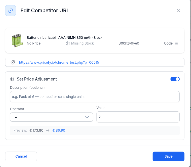 If the competitor URL has already been scraped at least once, the modal will display a live preview showing the original price and the adjusted result. This helps you verify that the rule produces the expected outcome before saving.